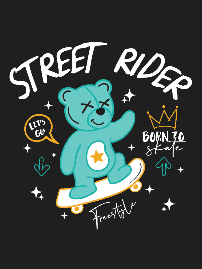 - Street Rider Teddy – Osito turquesa en skate, gorra, estrella en el pecho y frase 'STREET RIDER – LET'S GO! – BORN TO SKATE – Freestyle'. Vibra skater callejera con corona y estrellas. Ideal para camisetas juveniles y streetwear dinámico.