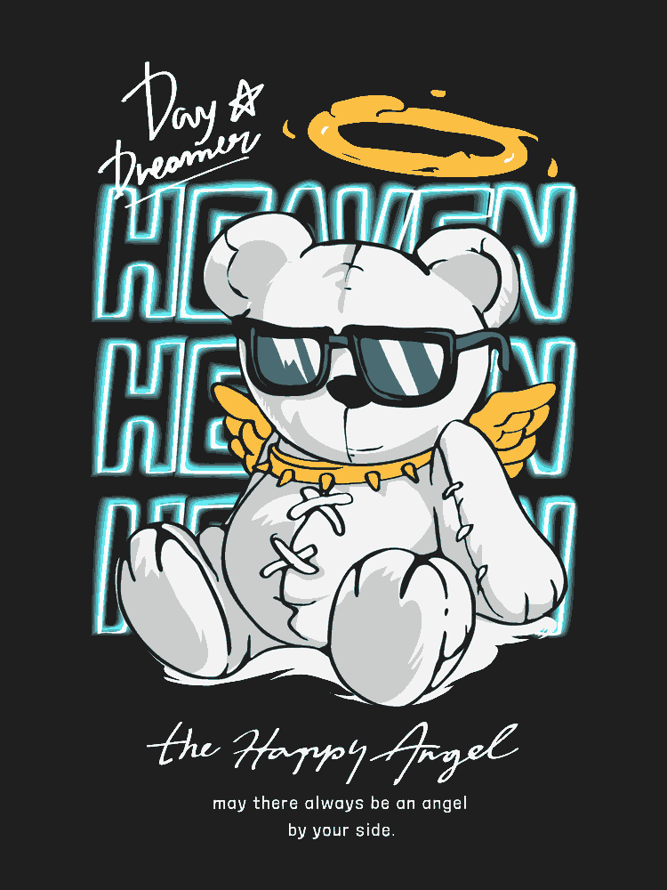 - Happy Angel Teddy – Osito blanco angelical con halo, gafas oscuras, alas doradas y collar con púas. Texto 'Day Dreamer – Heaven – the Happy Angel – may there always be an angel by your side'. Estilo dreamy y protector para camisetas cozy y positivas.