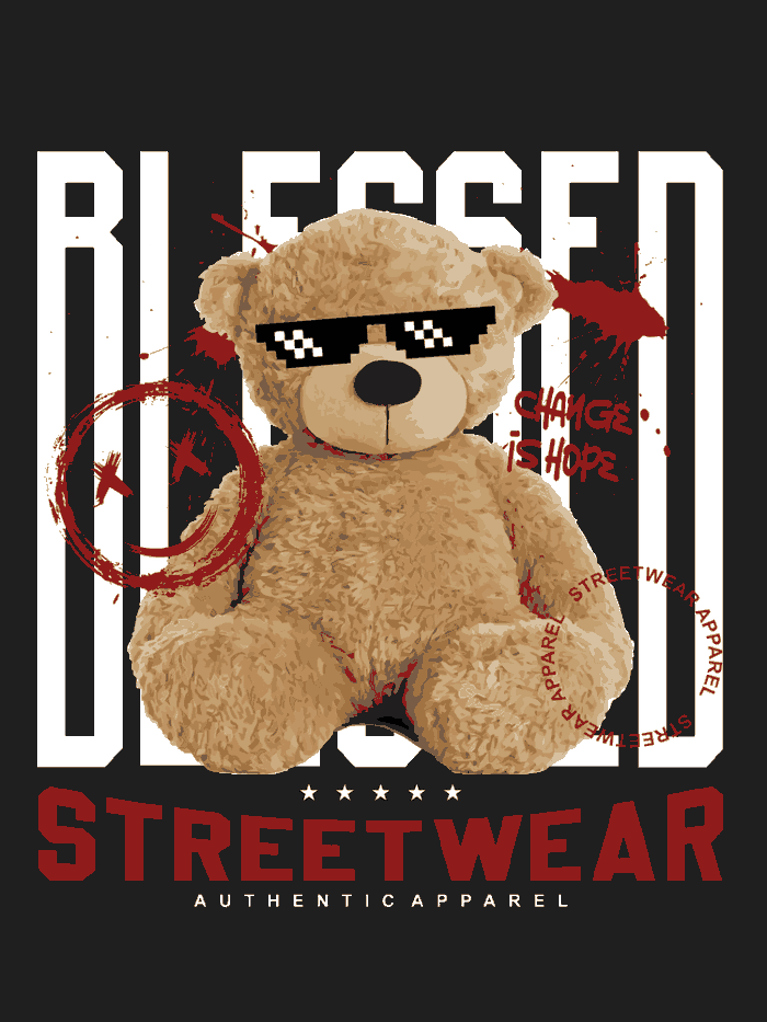 - Blessed Teddy – Osito marrón con gafas pixeladas, salpicaduras rojas y texto grande 'BLESSED – CHANGE IS HOPE – AUTHENTIC STREETWEAR APPAREL'. Diseño bendecido con vibe esperanza y street real para hoodies motivacionales.