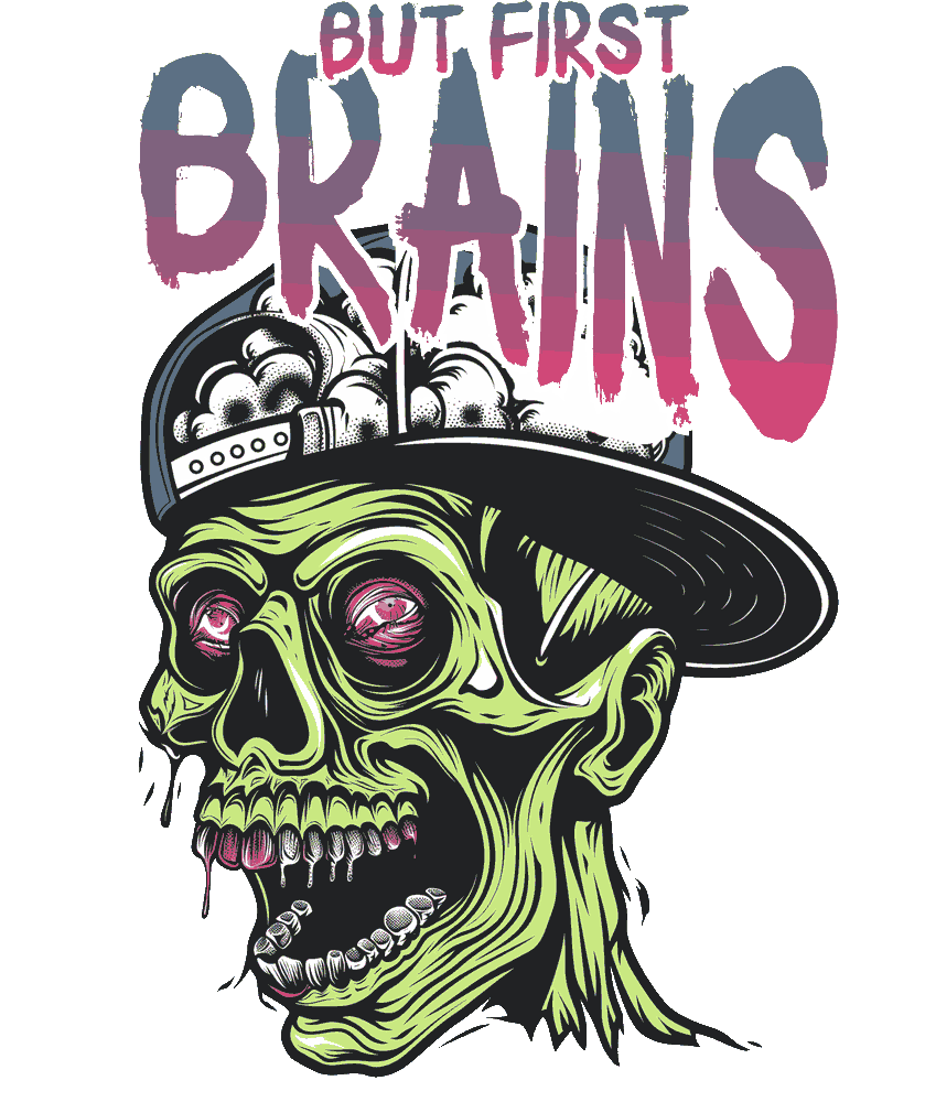 - But First Brains – Calavera zombie verde con gorra snapback, cerebro expuesto, ojos rosados y dientes sangrientos. Texto 'BUT FIRST BRAINS'. Estilo horror-cool con vibe undead y humor negro, perfecto para camisetas dark, hoodies party o merch alternativo.