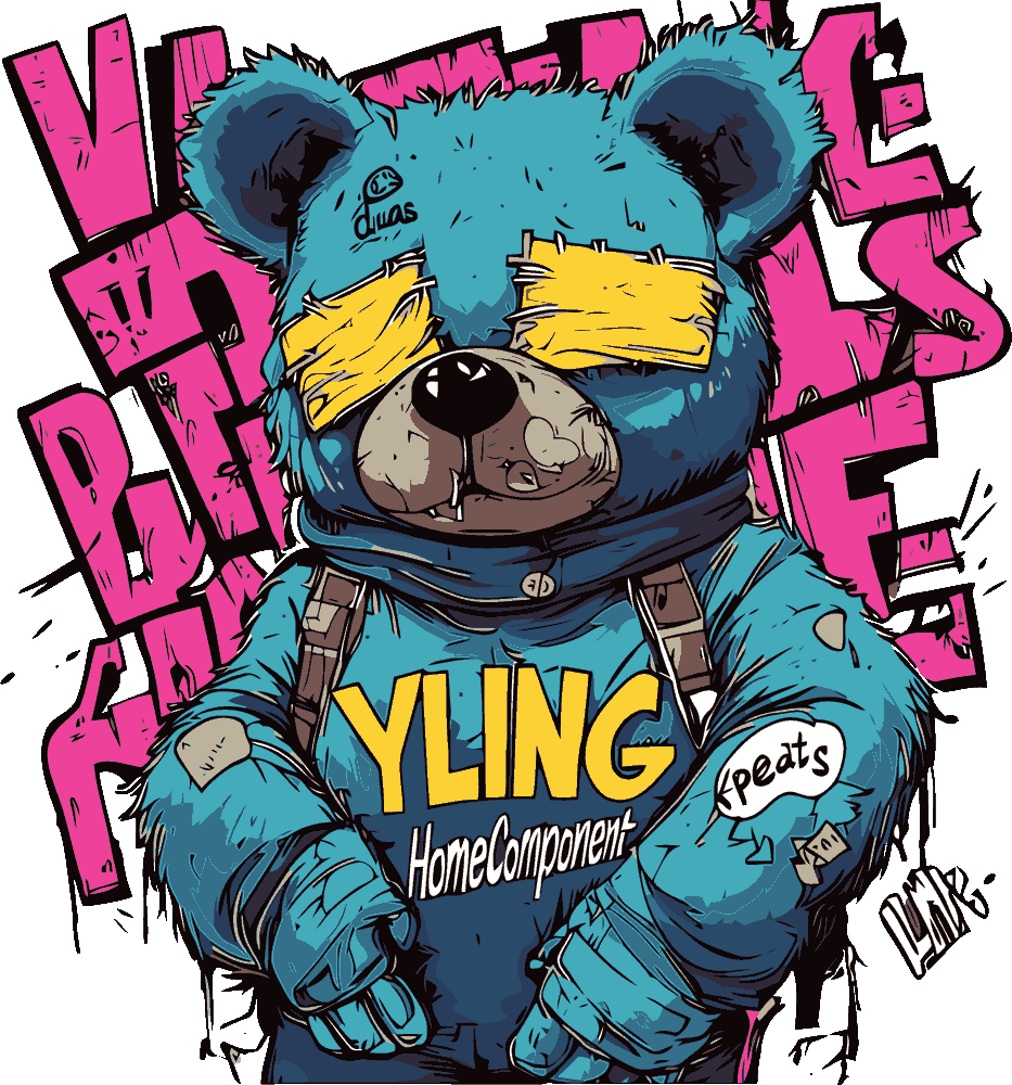 - Yling Bear ? – Oso azul militar con vendas amarillas en los ojos, chaqueta patched, tags "Yling HomeComponent" y estilo graffiti post-apocalíptico. Vibe rebelde, misteriosa y patched-up – ideal para los que viven al límite.