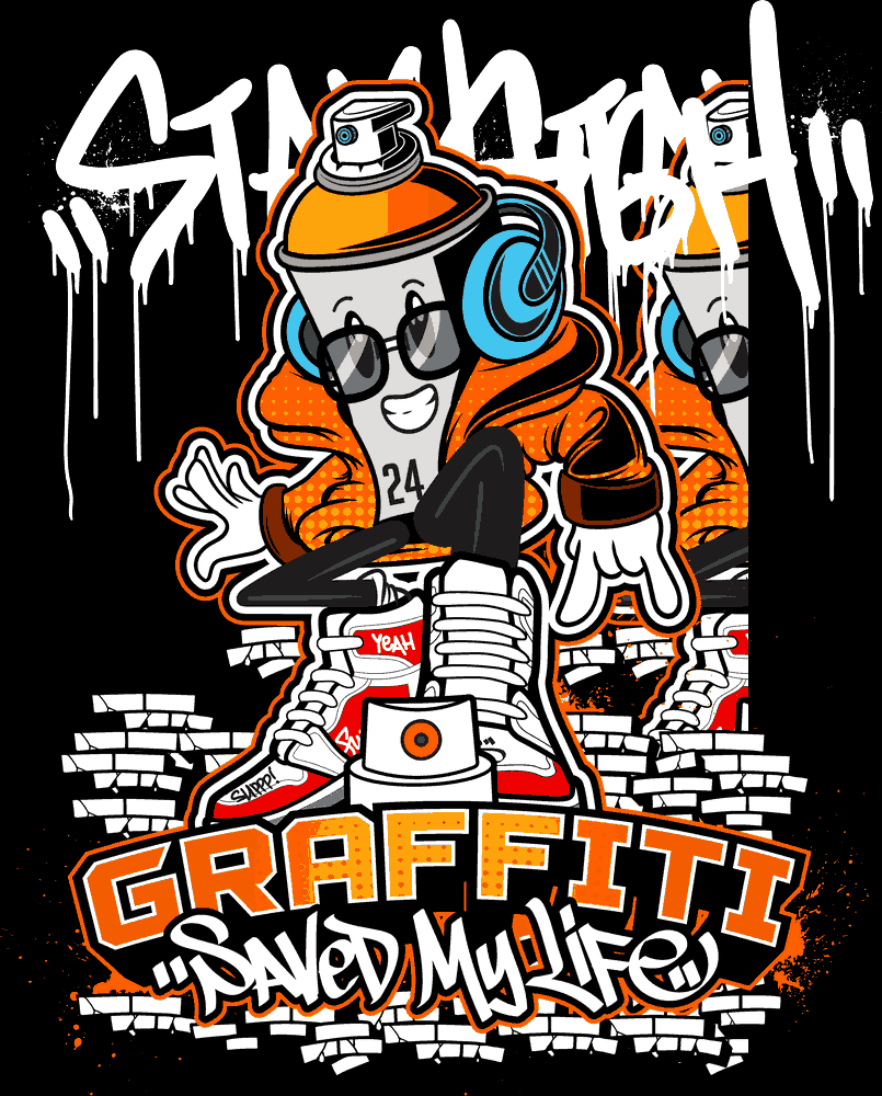 • Graffiti Saved My Life – Lata de spray antropomórfica con headphones, gafas y zapatillas, rodeada de graffiti dripping.