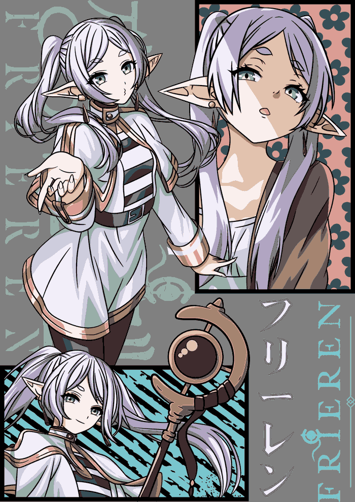 - Frieren the Elf Mage (Frieren: Beyond Journey's End): La elfa maga con ponytail plateado, orejas puntiagudas, bastón mágico rojo y expresión serena. Detalles florales, magia y texto japonés 'Frieren'. Estilo fantasy suave y detallado, ideal para posters mágicos o merch cozy.