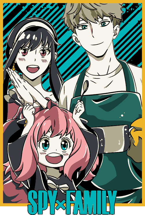 - Spy × Family – Familia Forger Hermoso diseño familiar con Loid, Yor y Anya en una escena divertida y tierna. Loid con delantal, Yor aplaudiendo y Anya con su expresión kawaii característica. Ideal para fans de la comedia y el espionaje familiar.