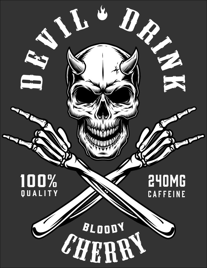 - Devil Drink Bloody Cherry – Calavera demoníaca con cuernos, huesos cruzados y detalles energy drink: '100% Quality – 240mg Caffeine – Bloody Cherry'. Estilo dark y energizante para latas custom, camisetas gym o merch de fiestas hardcore.