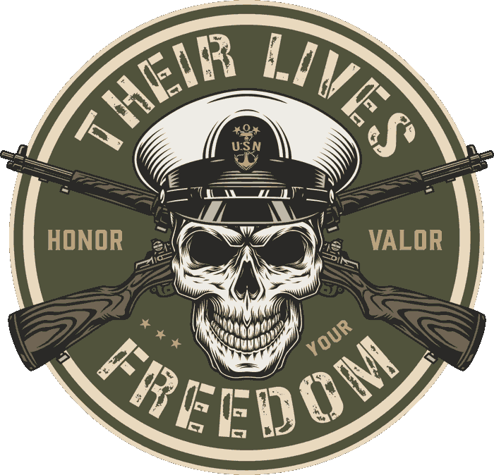 - Their Lives – US Navy – Calavera con gorra de marinero USN, rifles cruzados y frases 'Honor – Valor – Freedom'. Diseño patriótico y militar en tonos verde oliva, perfecto para hoodies, camisetas de veteranos o fans de fuerzas armadas.
