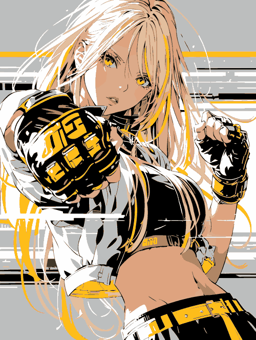 - Blonde Fighter Guerrera rubia de cabello largo con guantes negros y dorados, mirada intensa y pose agresiva. Diseño dinámico con estilo urbano y moderno.