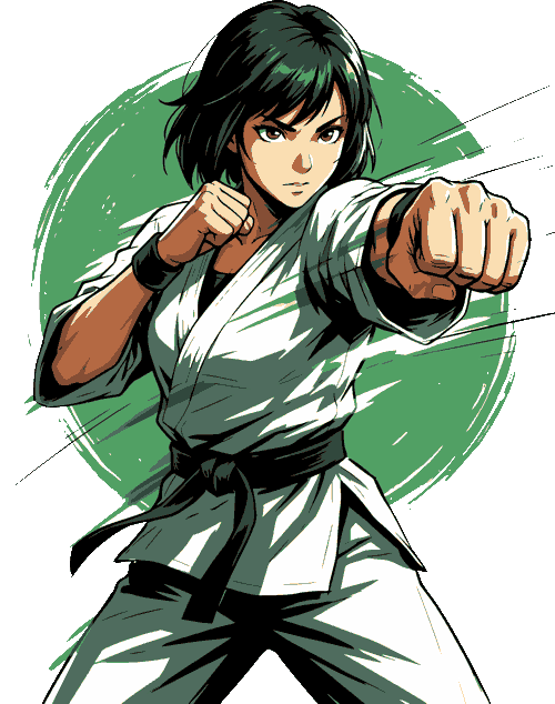 - Karateka Green Luchadora de karate con gi blanco y cinturón negro, ejecutando un puñetazo directo con fondo circular verde. Clásica y poderosa.