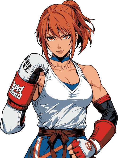 - Redhead Boxer Boxeadora pelirroja con guantes clásicos, top blanco y expresión seria. Representa fuerza, disciplina y espíritu combativo.