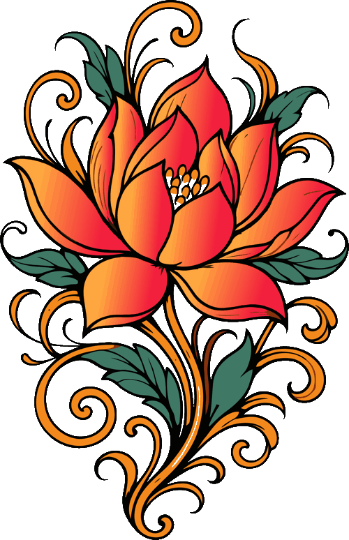 - Flor de Loto Ornamental Flor de loto estilizada en tonos rojos y naranjas intensos con hojas verdes y elegantes espirales. Diseño floral con toque tribal y espiritual.