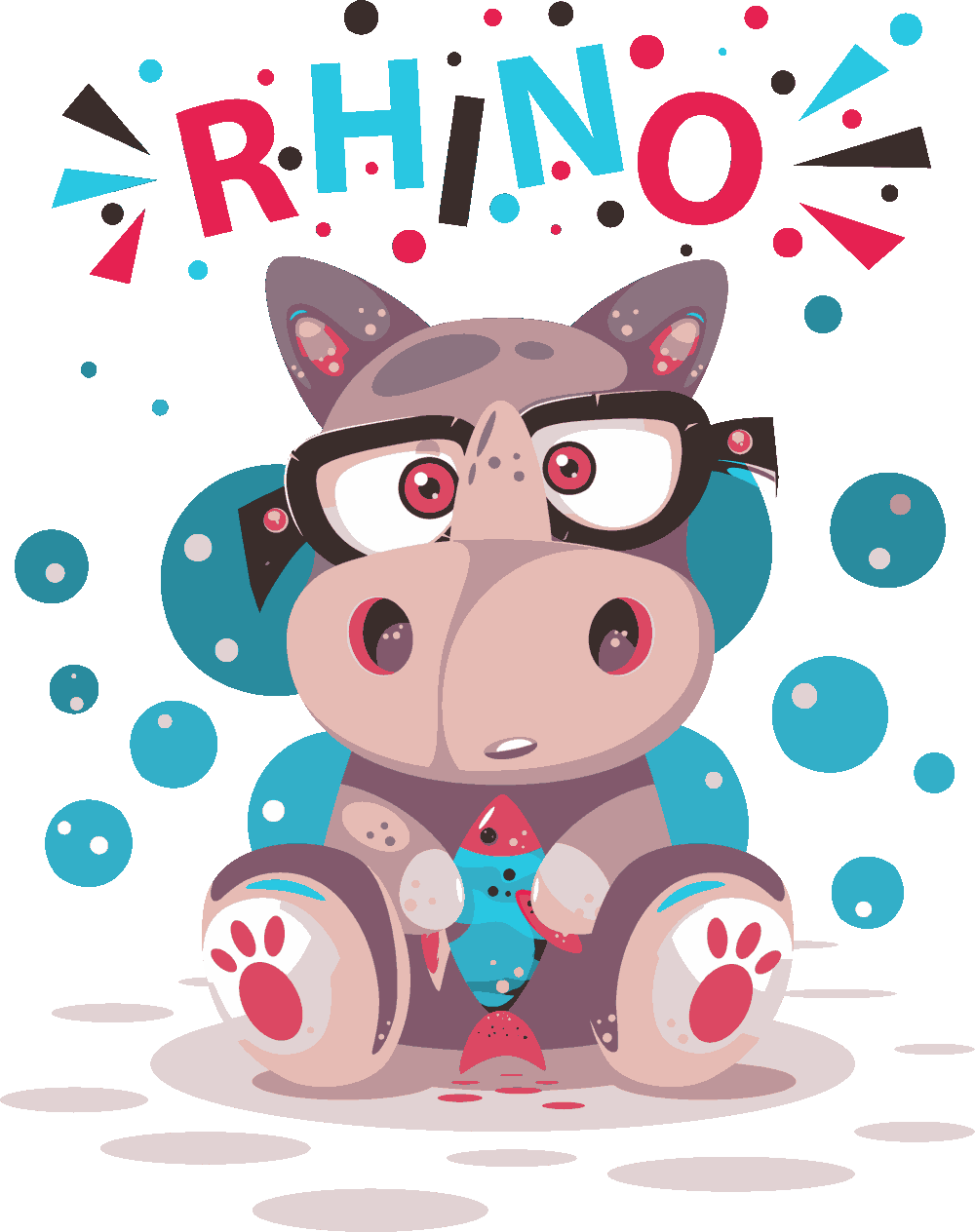 Rinoceronte "Cute-Rhino": La combinación perfecta de inteligencia y ternura. Un rinoceronte con gafas de pasta gruesa sosteniendo un pequeño pez, rodeado de elementos gráficos juguetones. Perfecto para diseños infantiles, educativos o con un toque "hipster". Incluye el texto "RHINO".