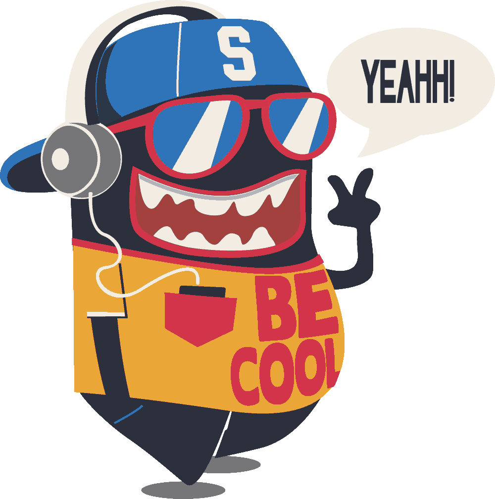 Monstruo "Yeahh Be Cool!": Un personaje lleno de energía con gorra, gafas de sol y auriculares, listo para contagiar su entusiasmo. Ideal para temas relacionados con música, juventud y actitud positiva. Incluye el mensaje "BE COOL".