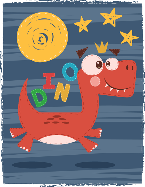 - Dinosaurio Rey Divertido dinosaurio rojo con corona, caminando bajo un sol y estrellas. Texto “DINO”. Perfecto para los peques que aman los dinosaurios.