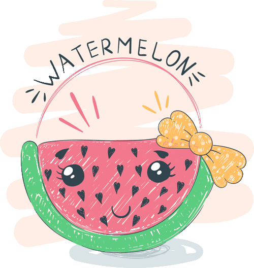 - Sandía Kawaii Rodaja de sandía sonriente con moño amarillo, pestañas y corazones. Texto “WATERMELON”. Fresca, alegre y veraniega.