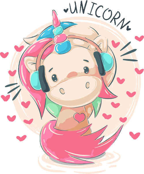 - Unicornio con Audífonos Cute unicornio con cabello rosa, audífonos y corazones flotando alrededor. Texto “UNICORN”. Súper tierno y musical.