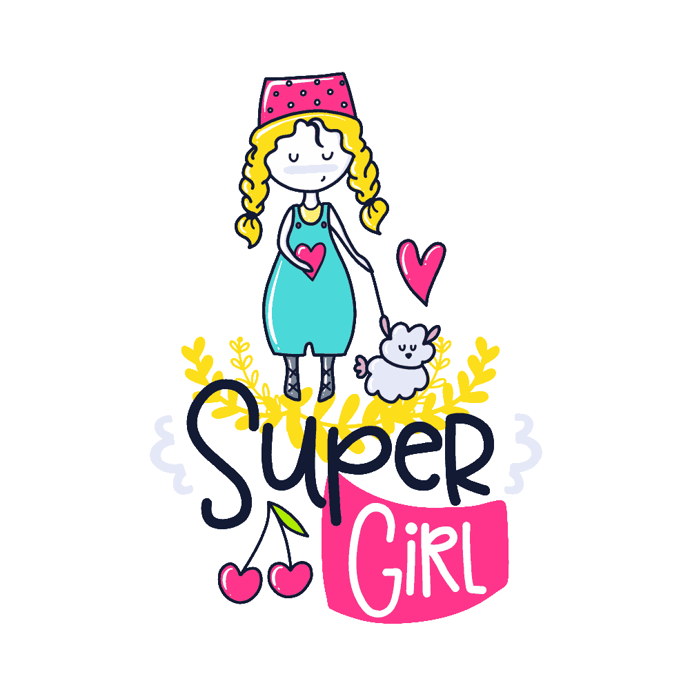 - Super Girl Una niña valiente con capa de superhéroe, corazón en la pancita y su perrito volador. Perfecta para las pequeñas heroínas de la casa.