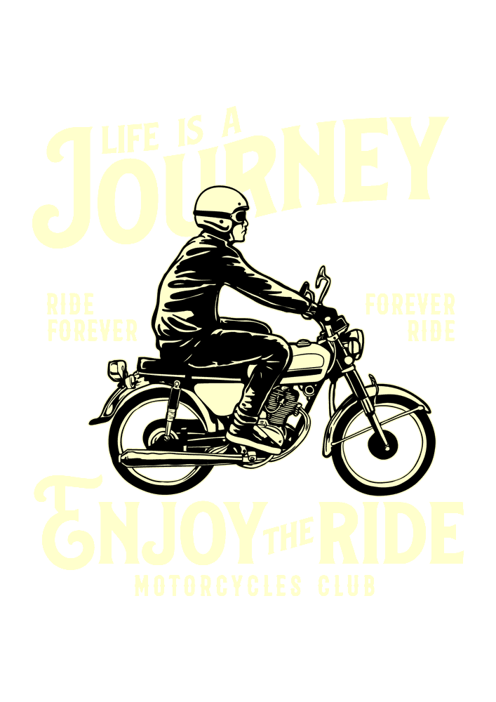 - Life is a Journey – Silueta clásica de rider en moto vintage, casco y frase motivacional 'Ride Forever – Enjoy the Ride – Motorcycles Club'. Perfecto para camisetas filosóficas y de club.