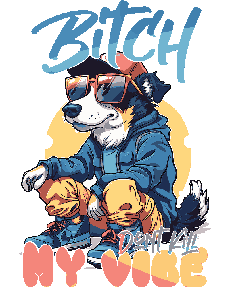 - Bitch Don't Kill My Vibe – Perro border collie cool con gafas de sol, gorra, hoodie azul y pantalones cargo. Texto drip 'BITCH DON'T KILL MY VIBE' y 'DON'T KILL MY VIBE'. Diseño divertido pero duro para amantes de los perros con flow streetwear. ¡Pura energía positiva y 'no me jodas'!