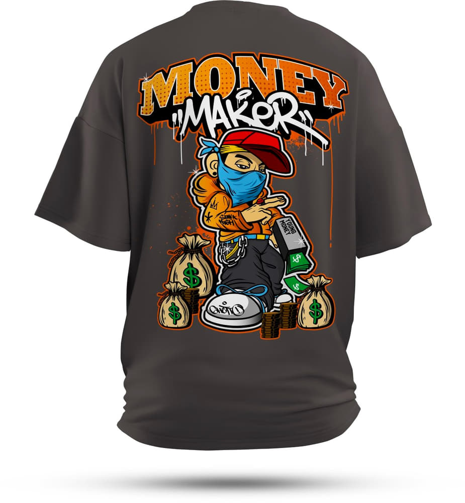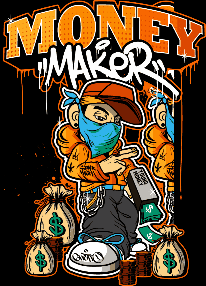 • Money Maker – Personaje street con máscara, dinero, bolsas de billetes y el texto “MONEY MAKER”.