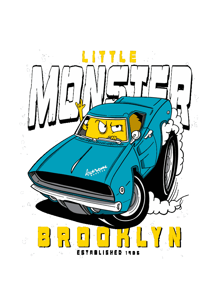 - Little Monster Brooklyn: El monstruito amarillo más rockero derrapando en su muscle car azul custom – humo en las ruedas, cuernos, mano rock y 'Brooklyn' abajo. Flow callejero total con attitude de hot rod y street monster.