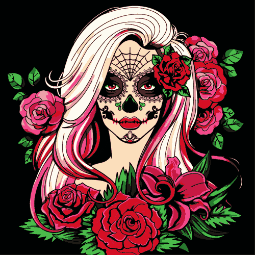- Calavera Rosa con Rosas Magenta Elegante calavera con cabello rosa intenso, flores grandes, collar de encaje y detalles azules. Diseño femenino y sofisticado.