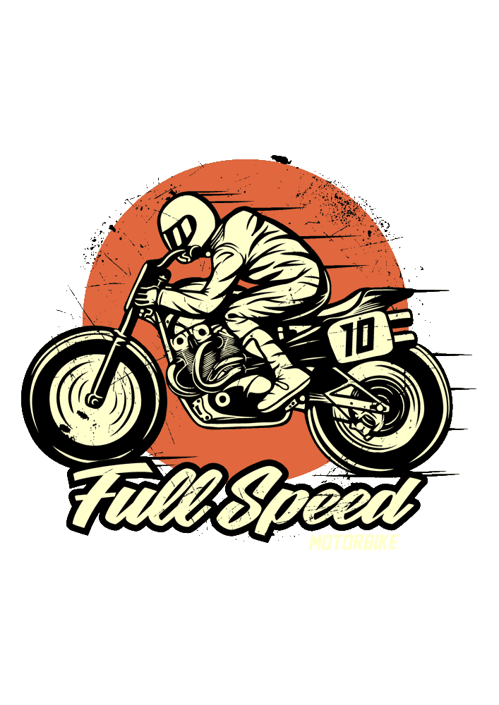 - Full Speed – Rider agresivo en pose de carrera, número 10, fondo sol naranja y texto 'Full Speed Motorbike'. Ideal para velocidad y adrenalina.
