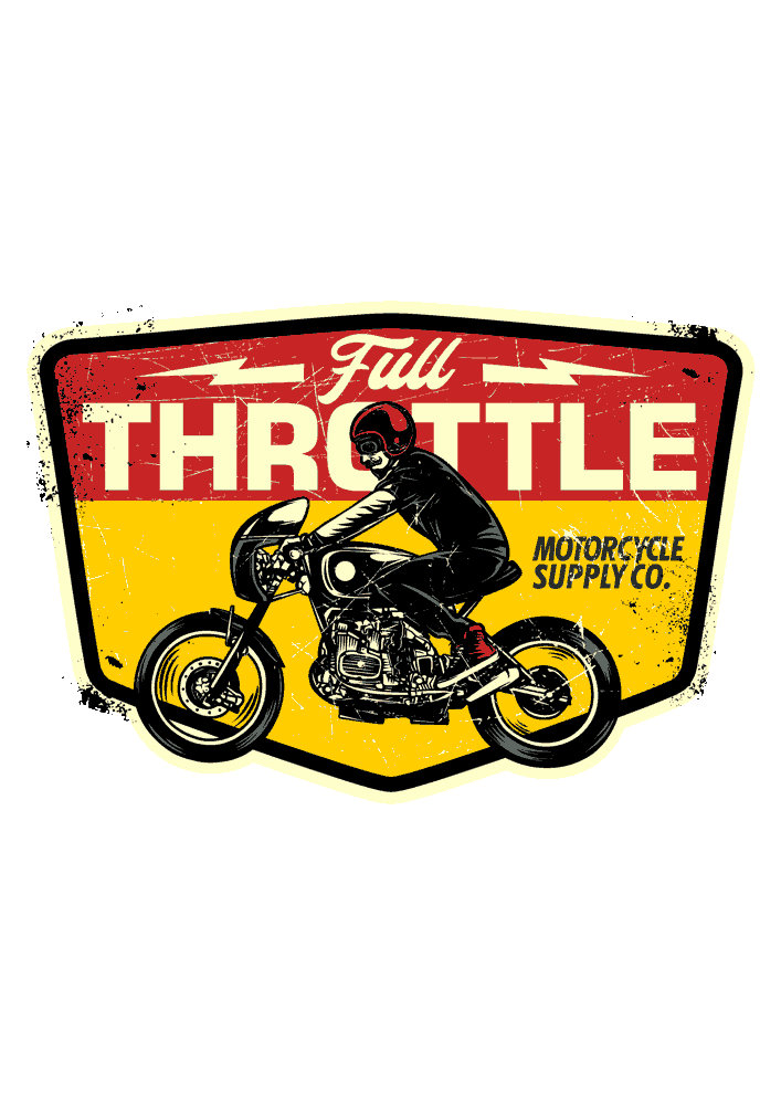 - Full Throttle – Logo estilo parche con rider inclinado, rayos, fondo rojo-amarillo y 'Full Throttle Motorcycle Supply Co.'. Vibe supply/co. custom.